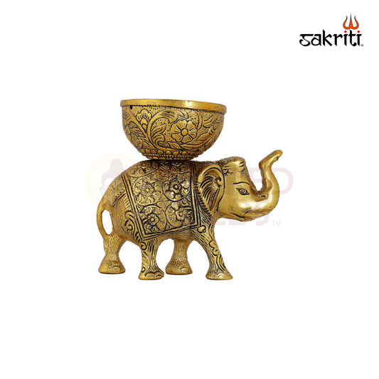 Aluminium Elephant with Bowl Gold Polish – 5.6 Inch Artistic Décor for Temple/Home