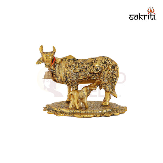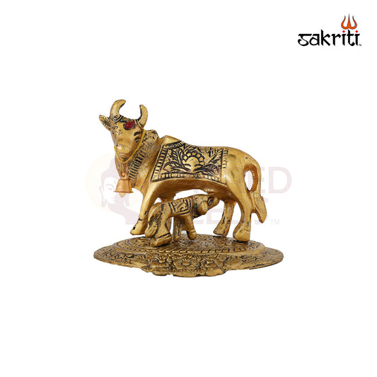 Aluminium Cow & Calf Idol Gold Polish – 6.1 Inch Traditional Hindu Home Décor