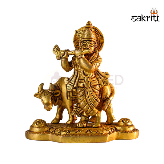 Sacred Needs Brass Cow Krishna Idol – 4.4 Inch (11.2 cm) Height | Krishna with Cow Statue for Pooja Room, Temple & Home Décor