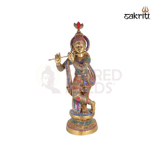 Brass Krishna with Stone – 37 Inch Full Idol Decorated with Semi-Precious Stones