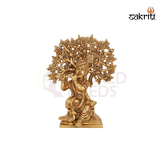 Brass Lord Krishna with Tree – 8.3 Inch Divine Scene Sculpture
