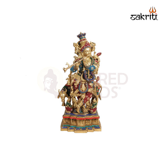Brass Cow & Krishna with Stone Work – 27.2 Inch Colorful Decor
