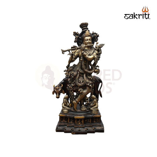Brass Krishna with Sacred Cow – 24 Inch Black Finish Idol for Home Temple