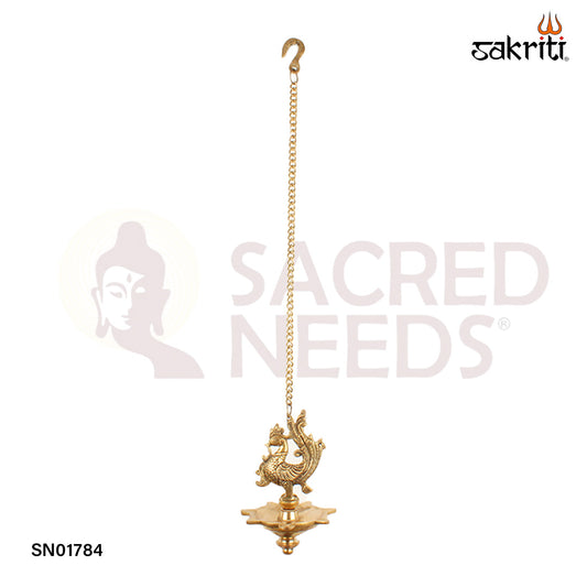 Brass 4 Mukh Peacock Hanging Vilakku – 26 Inch Height | 4-Spout Brass Lamp with Peacock Design for Temple Decor
