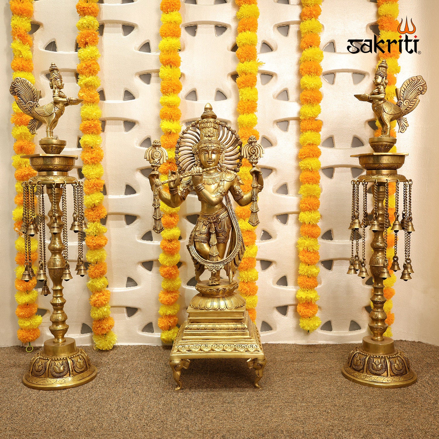 Enhance the divine aura in your home with our BRASS KRISHNA WITH SHANKH CHAKRA. Made from high-quality brass, this beautifully crafted statue of Lord Krishna holding a shankh (conch) and chakra (discus) represents protection and peace. Bring blessings and positive energy into your space with this exquisite piece.